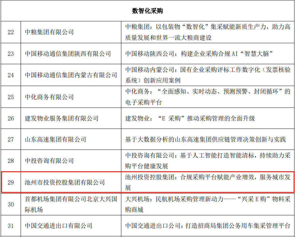 近日,中國物流與采購聯(lián)合會公共采購分會面向國企采購領域征集優(yōu)秀案例活動公布了評審結果,池州市投資控股集團有限公司合規(guī)采購平臺以“合規(guī)采購平臺賦能產(chǎn)業(yè)增效,服務城市發(fā)展”為題,獲評2024年度全國公共采購數(shù)智化采購優(yōu)秀案例。