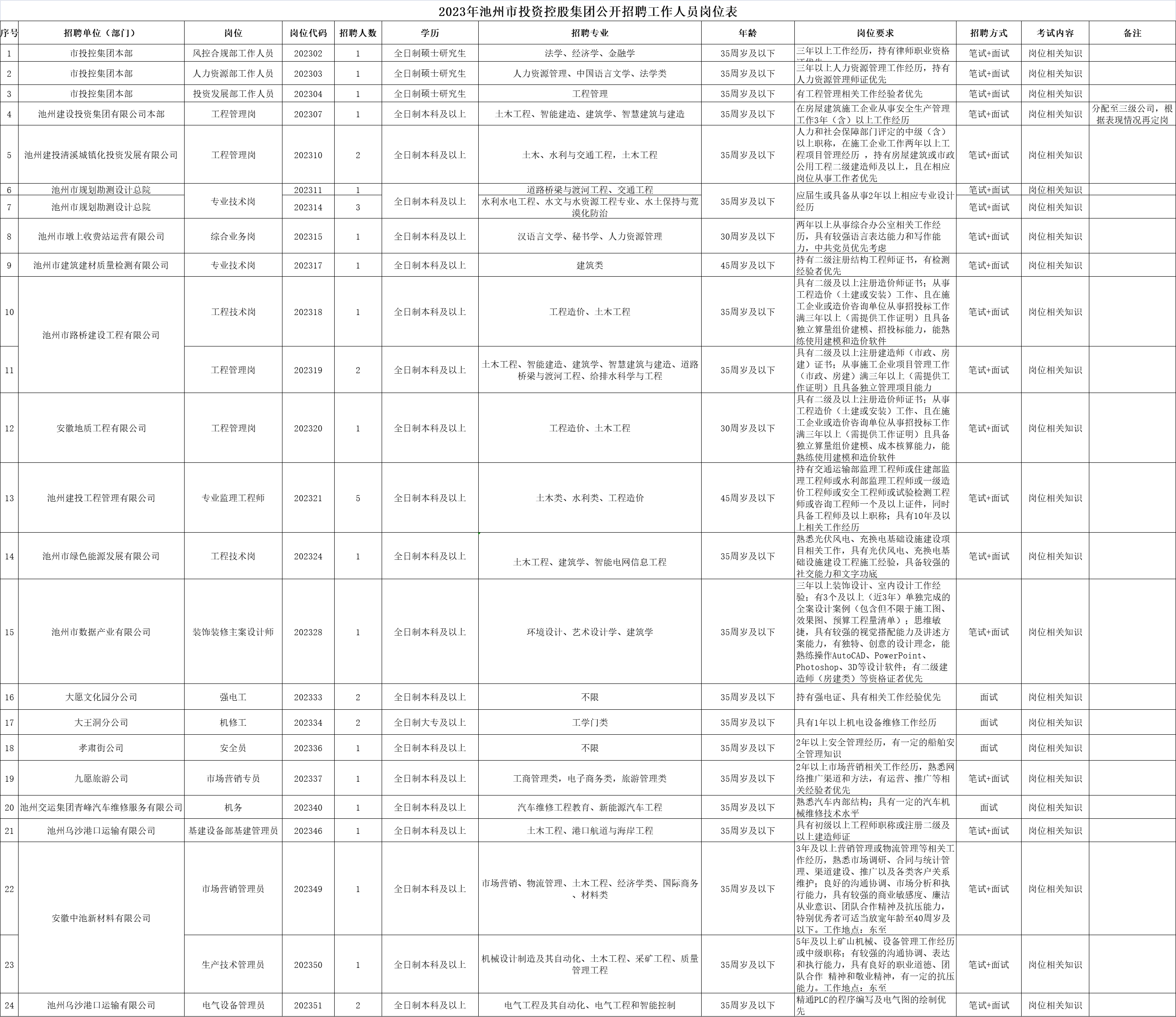 2023年池州市投資控股集團(tuán)公開招聘報(bào)名工作即將結(jié)束,截止2023年9月15日20:00,共有24個(gè)職位35個(gè)計(jì)劃招聘數(shù)暫時(shí)無(wú)人報(bào)考或達(dá)不到開考比例,如2023年9月17日24:00報(bào)名時(shí)間截止前仍達(dá)不到開考比例,將核減或取消該崗位招聘計(jì)劃。有意向報(bào)名人員請(qǐng)登陸池州人事考試網(wǎng)(http://rskszx.czsrsj.chizhou.gov.cn)報(bào)名,審核未通過人員可改報(bào)其他符合條件崗位。