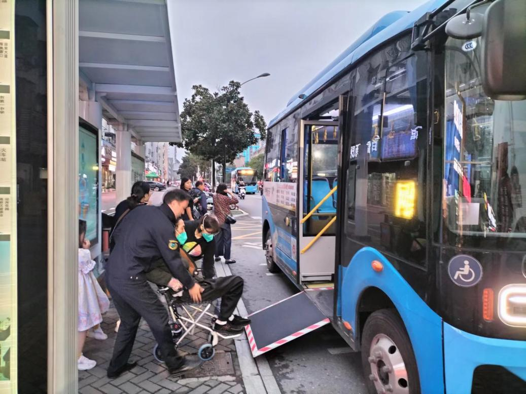 17:46分,金師傅到達市人民醫(yī)院公交站,停穩(wěn)開門后,章征彥迅速放下無障礙上下車踏板,金師傅下車幫忙將老人推上車,并調(diào)整輪椅位置,確保穩(wěn)固。17:52分,抵達清溪橋公交站下車點,章征彥和金師傅再次協(xié)助將輪椅老人推下車。