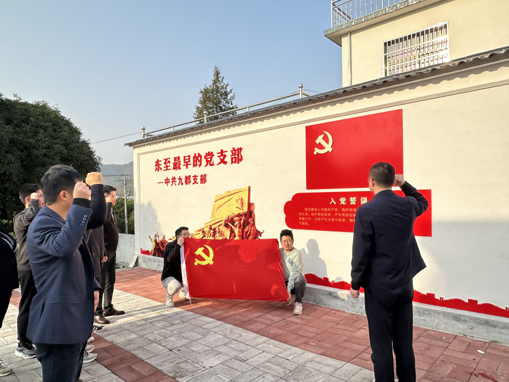 在活動中兩支部的同志藏參觀了中共九都支部紀念館、胡炳炎故居,在這里大家受到了深刻的思想教育和精神洗禮。隨后全體黨員同志在廣場面向黨旗、高舉右拳,莊嚴宣誓。黨員同志們通過重溫入黨誓詞,回顧申請入黨時的滿腔熱血和堅定決心。提醒自己時刻牢記誓言,終身踐行誓言。