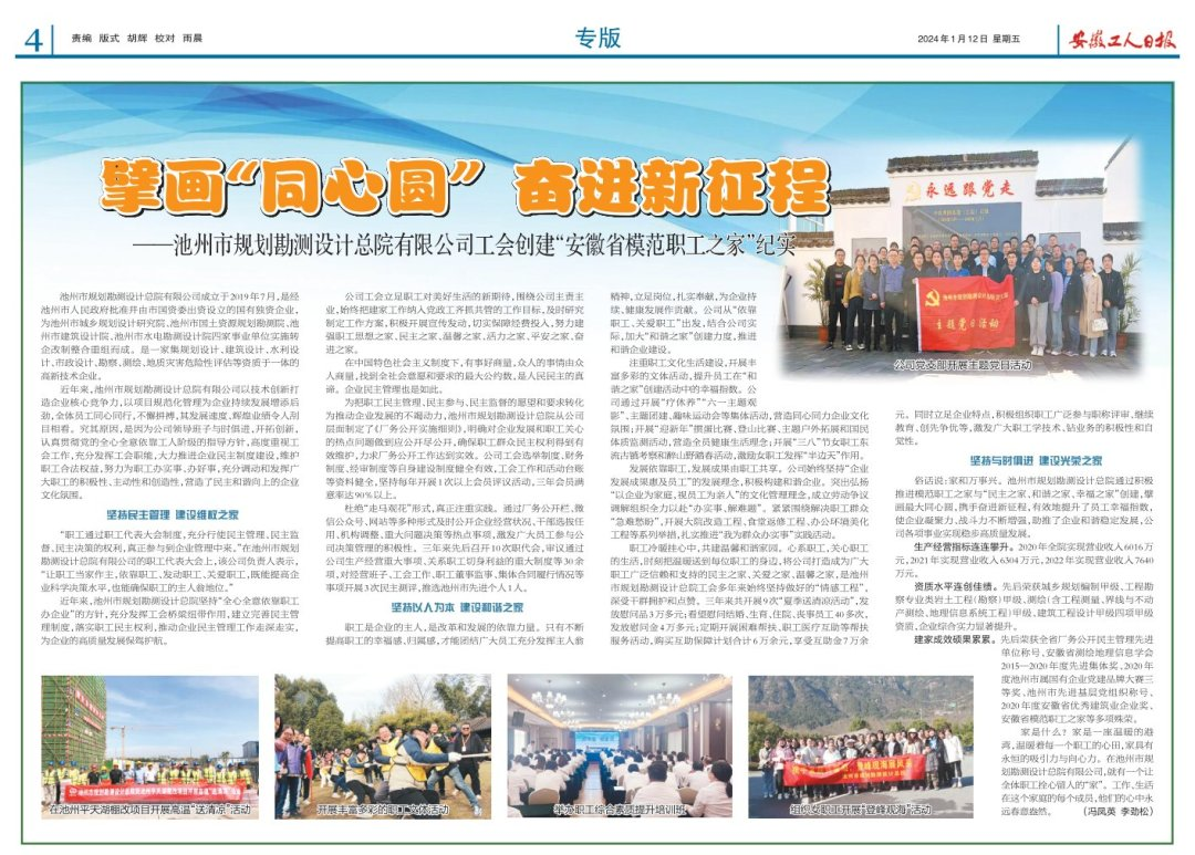 俗話說(shuō):家和萬(wàn)事興。池州市規(guī)劃勘測(cè)設(shè)計(jì)總院通過(guò)積極推進(jìn)模范職工之家與“民主之家、和諧之家、幸福之家”創(chuàng)建,擘畫(huà)最大同心圓,攜手奮進(jìn)新征程,有效地提升了員工幸福指數(shù),使企業(yè)凝聚力、戰(zhàn)斗力不斷增強(qiáng),助推了企業(yè)和諧穩(wěn)定發(fā)展,公司各項(xiàng)事業(yè)實(shí)現(xiàn)穩(wěn)步高質(zhì)量發(fā)展。生產(chǎn)經(jīng)營(yíng)指標(biāo)連連攀升。2020年全院實(shí)現(xiàn)營(yíng)業(yè)收入6016萬(wàn)元,2021年實(shí)現(xiàn)營(yíng)業(yè)收入6304萬(wàn)元,2022年實(shí)現(xiàn)營(yíng)業(yè)收入7640萬(wàn)元。資質(zhì)水平連創(chuàng)佳績(jī)。先后榮獲城鄉(xiāng)規(guī)劃編制甲級(jí)、工程勘察專業(yè)類巖土工程(勘察)甲級(jí)、測(cè)繪(含工程測(cè)量、界線與不動(dòng)產(chǎn)測(cè)繪、地理信息系統(tǒng)工程)甲級(jí)、建筑工程設(shè)計(jì)甲級(jí)四項(xiàng)甲級(jí)資質(zhì),企業(yè)綜合實(shí)力顯著提升。建家成效碩果累累。先后榮獲全省廠務(wù)公開(kāi)民主管理先進(jìn)單位、安徽省測(cè)繪地理信息學(xué)會(huì)2015—2020年度先進(jìn)集體獎(jiǎng);2020年度池州市屬國(guó)有企業(yè)黨建品牌大賽三等獎(jiǎng);池州市先進(jìn)基層黨組織稱號(hào);2020年度安徽省優(yōu)秀建筑業(yè)企業(yè)獎(jiǎng);安徽省模范職工之家等多項(xiàng)殊榮。