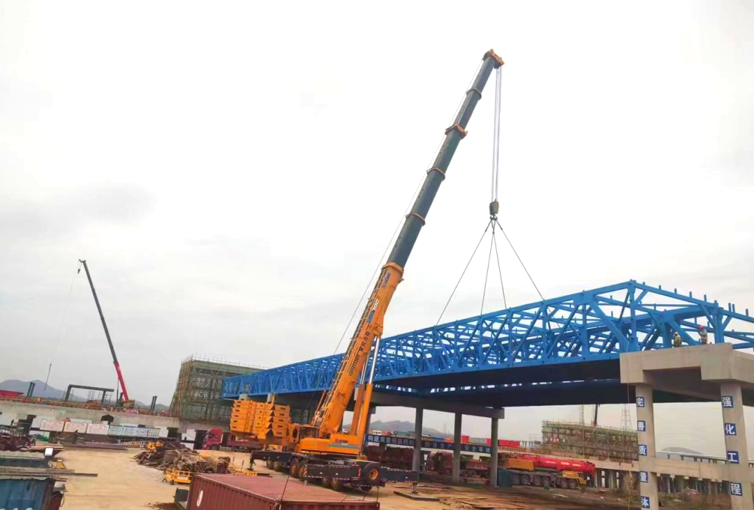 此次吊裝的兩座鋼引橋長度均為54.6米,8米寬型重108噸,12米寬型重163噸,屬超危大工程,且引橋橫跨長江大堤,坡頂?shù)狡履_的坡度小,存在“場(chǎng)地小、機(jī)械多、人員多、工序多”的情況,進(jìn)一步增加了安全風(fēng)險(xiǎn)和施工難度。