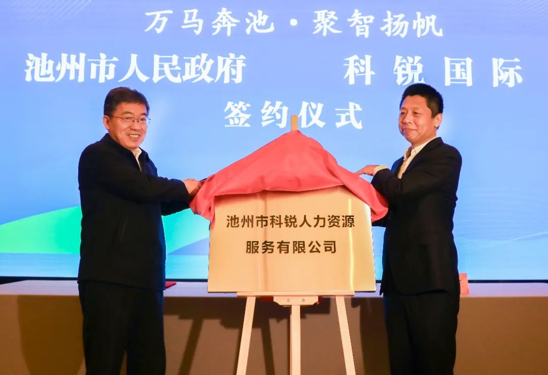 4月2日上午,池州市政府與科銳國際合作交流座談會暨合作項目簽約儀式舉行。市委書記朱浩東、科銳國際董事長高勇出席并講話,共同為池州市科銳人力資源服務(wù)有限公司揭牌。市領(lǐng)導(dǎo)史孺牛、廖強、李軍等參加。