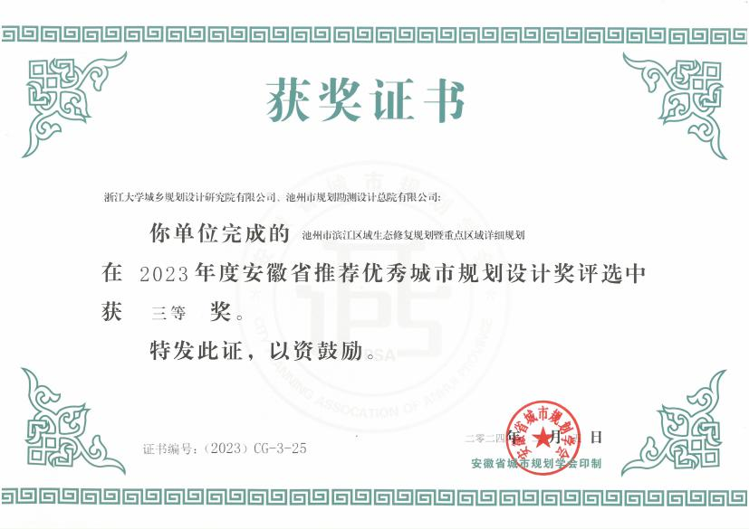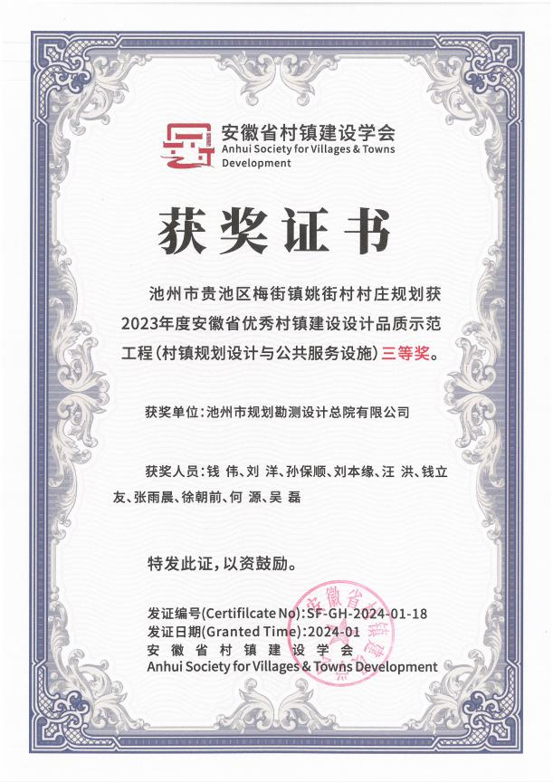 近日,安徽省村鎮(zhèn)建設學會和安徽省城市規(guī)劃學會分別揭曉了2023年度安徽省優(yōu)秀村鎮(zhèn)建設設計品質(zhì)示范工程和2023年度安徽省推薦優(yōu)秀城市規(guī)劃設計獎的獲獎名單。由集團所屬設計總院公司編制完成的《池州市貴池區(qū)梅街鎮(zhèn)姚街村村莊規(guī)劃》和《池州市濱江區(qū)域生態(tài)修復規(guī)劃暨重點區(qū)域詳細規(guī)劃》兩個項目分別榮獲2023年度安徽省優(yōu)秀村鎮(zhèn)建設設計品質(zhì)示范工程(村鎮(zhèn)規(guī)劃設計與公共服務設施)三等獎和2023年度安徽省推薦優(yōu)秀城市規(guī)劃設計獎三等獎。